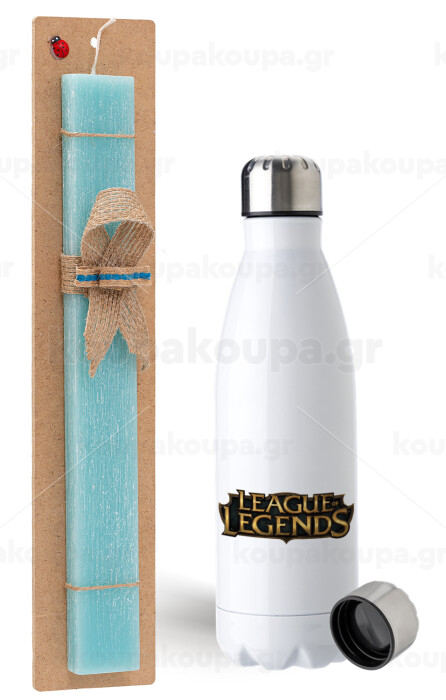 League of Legends LoL, Easter Set, metallic stainless steel water bottle (750ml) & aromatic flat Easter candle (30cm) (TURQUOISE)