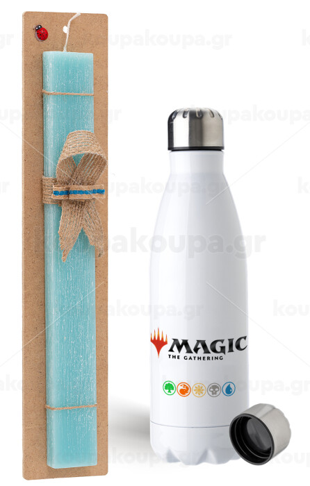 Magic the Gathering, Easter Set, metallic stainless steel water bottle (750ml) & aromatic flat Easter candle (30cm) (TURQUOISE)