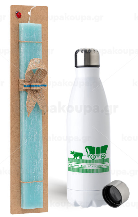 Oregon Trail, cov... edition, Easter Set, metallic stainless steel water bottle (750ml) & aromatic flat Easter candle (30cm) (TURQUOISE)