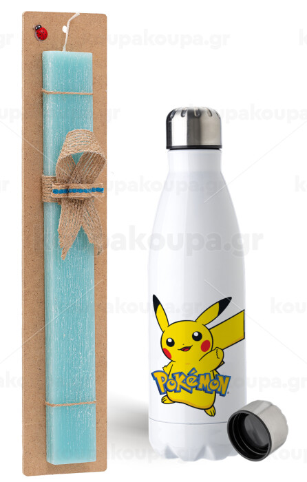 Pokemon pikachu, Easter Set, metallic stainless steel water bottle (750ml) & aromatic flat Easter candle (30cm) (TURQUOISE)