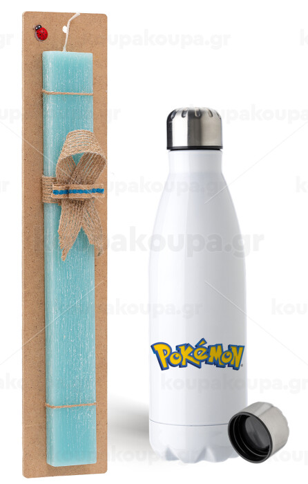 Pokemon, Easter Set, metallic stainless steel water bottle (750ml) & aromatic flat Easter candle (30cm) (TURQUOISE)