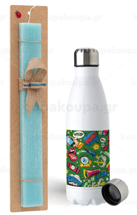 Pop art colorful seamless, Easter Set, metallic stainless steel water bottle (750ml) & aromatic flat Easter candle (30cm) (TURQUOISE)