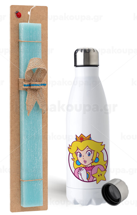 Princess Peach, Easter Set, metallic stainless steel water bottle (750ml) & aromatic flat Easter candle (30cm) (TURQUOISE)