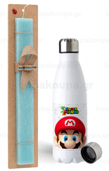 Super mario, Easter Set, metallic stainless steel water bottle (750ml) & aromatic flat Easter candle (30cm) (TURQUOISE)