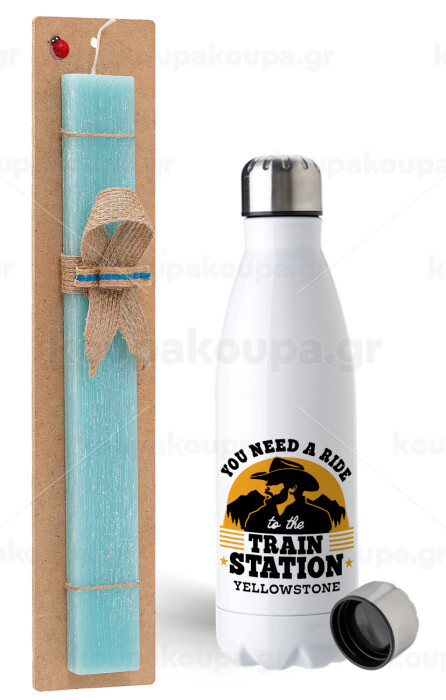 You need a ride to the train station, Easter Set, metallic stainless steel water bottle (750ml) & aromatic flat Easter candle (30cm) (TURQUOISE)