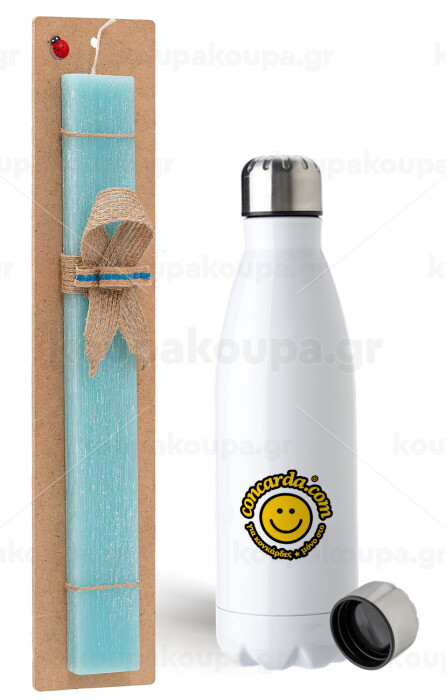 Concarda, Easter Set, metallic stainless steel water bottle (750ml) & aromatic flat Easter candle (30cm) (TURQUOISE)