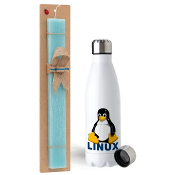 Linux, Easter Set, metallic stainless steel water bottle (750ml) & aromatic flat Easter candle (30cm) (TURQUOISE)