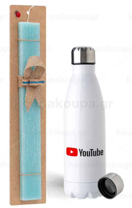 Youtube, Easter Set, metallic stainless steel water bottle (750ml) & aromatic flat Easter candle (30cm) (TURQUOISE)