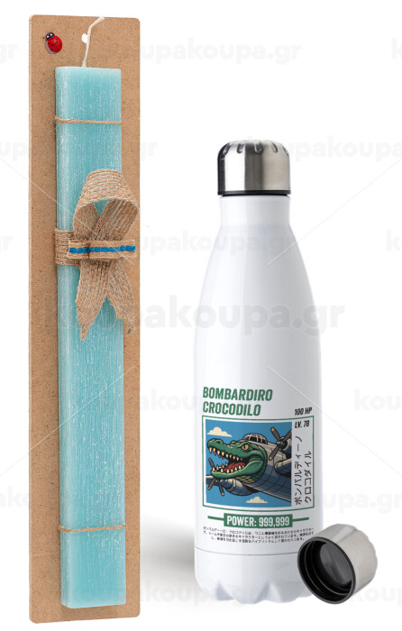 Bombardiro Crocodilo, Easter Set, metallic stainless steel water bottle (750ml) & aromatic flat Easter candle (30cm) (TURQUOISE)