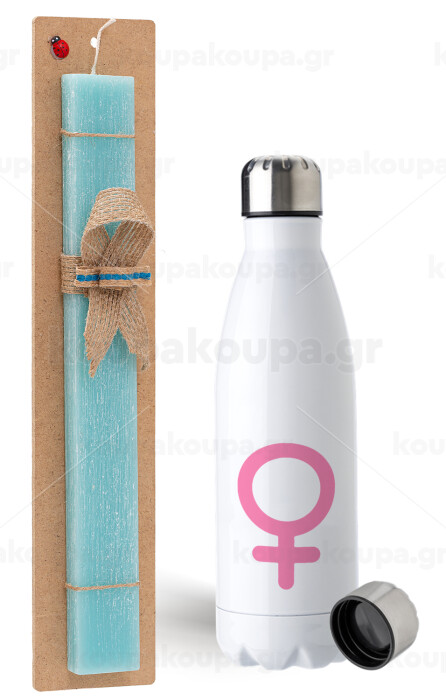 FEMALE, Easter Set, metallic stainless steel water bottle (750ml) & aromatic flat Easter candle (30cm) (TURQUOISE)