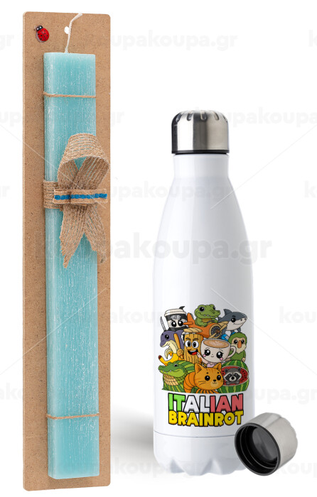 Italian Brainrot friends, Easter Set, metallic stainless steel water bottle (750ml) & aromatic flat Easter candle (30cm) (TURQUOISE)