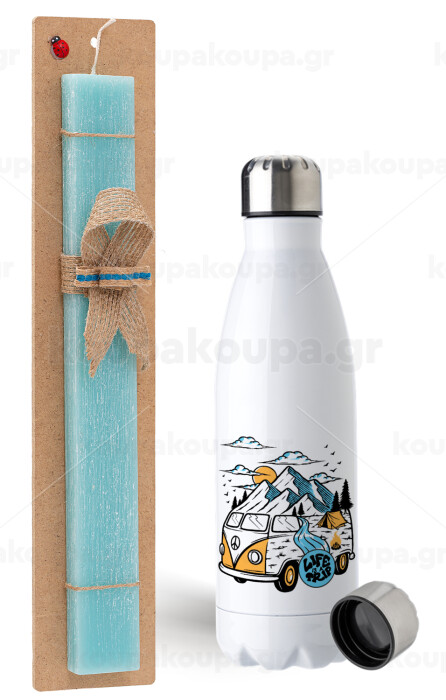 Life is a trip, Easter Set, metallic stainless steel water bottle (750ml) & aromatic flat Easter candle (30cm) (TURQUOISE)