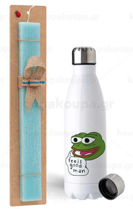 Pepe the frog, Easter Set, metallic stainless steel water bottle (750ml) & aromatic flat Easter candle (30cm) (TURQUOISE)
