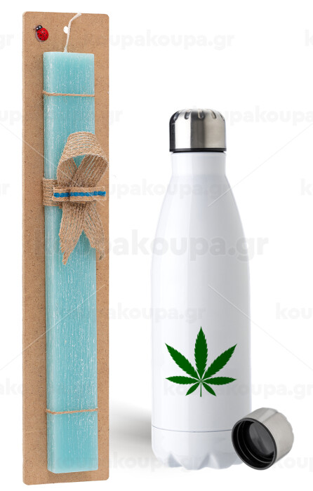 Weed, Easter Set, metallic stainless steel water bottle (750ml) & aromatic flat Easter candle (30cm) (TURQUOISE)