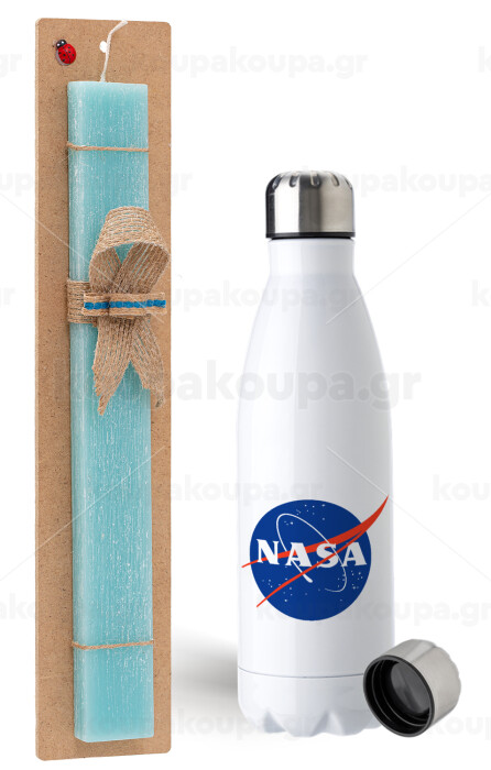 Nasa, Easter Set, metallic stainless steel water bottle (750ml) & aromatic flat Easter candle (30cm) (TURQUOISE)