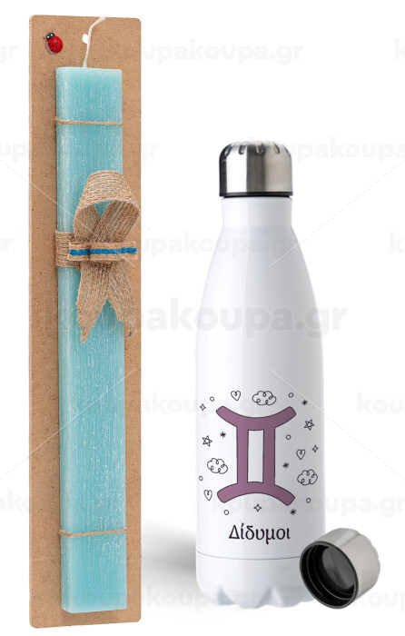 Ζώδια Δίδυμοι, Easter Set, metallic stainless steel water bottle (750ml) & aromatic flat Easter candle (30cm) (TURQUOISE)