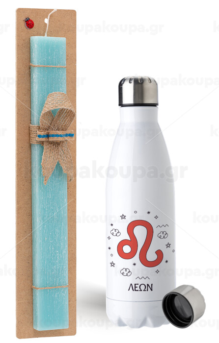 Ζώδια Λέων, Easter Set, metallic stainless steel water bottle (750ml) & aromatic flat Easter candle (30cm) (TURQUOISE)