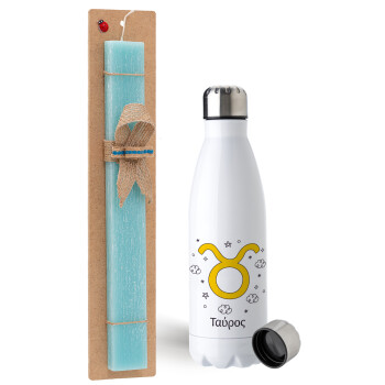Ζώδια Ταύρος, Easter Set, metallic stainless steel water bottle (750ml) & aromatic flat Easter candle (30cm) (TURQUOISE)