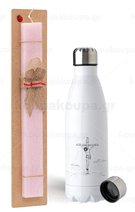 Jesus Christ , Easter Set, metallic stainless steel water bottle (750ml) & scented flat Easter candle (30cm) (PINK)