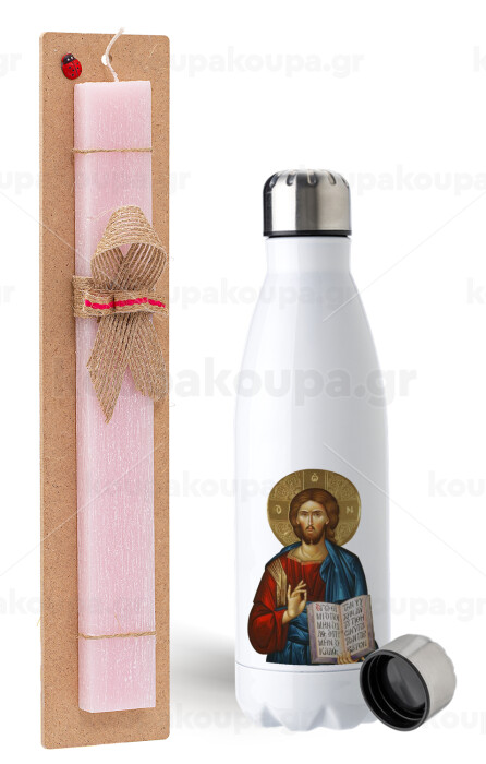 Jesus, Easter Set, metallic stainless steel water bottle (750ml) & scented flat Easter candle (30cm) (PINK)