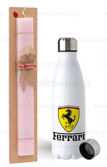 Ferrari S.p.A., Easter Set, metallic stainless steel water bottle (750ml) & scented flat Easter candle (30cm) (PINK)