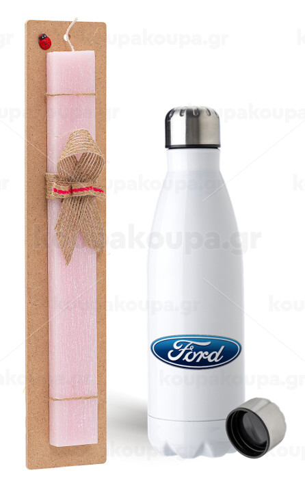 Ford, Easter Set, metallic stainless steel water bottle (750ml) & scented flat Easter candle (30cm) (PINK)