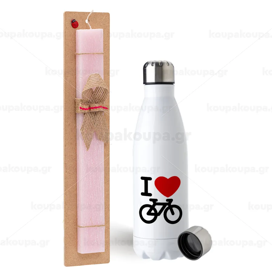 I love Bike, Easter Set, metallic stainless steel water bottle (750ml) & scented flat Easter candle (30cm) (PINK)