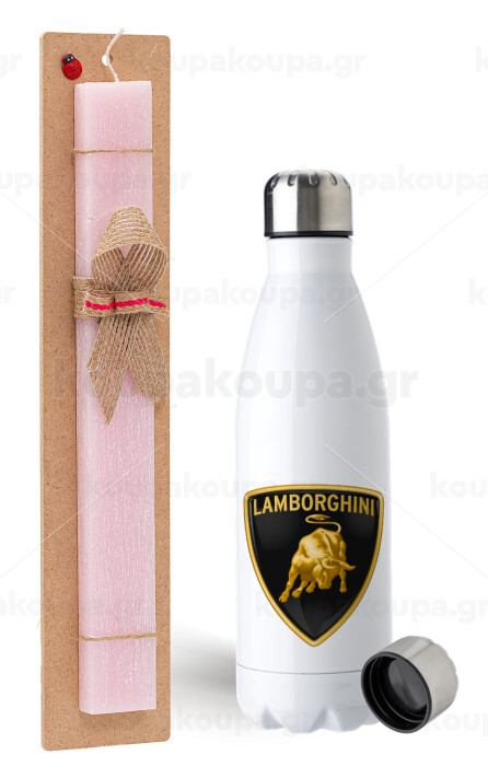 Lamborghini, Easter Set, metallic stainless steel water bottle (750ml) & scented flat Easter candle (30cm) (PINK)