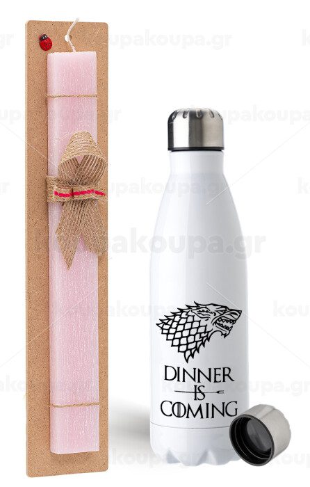 Dinner is coming (GOT), Easter Set, metallic stainless steel water bottle (750ml) & scented flat Easter candle (30cm) (PINK)