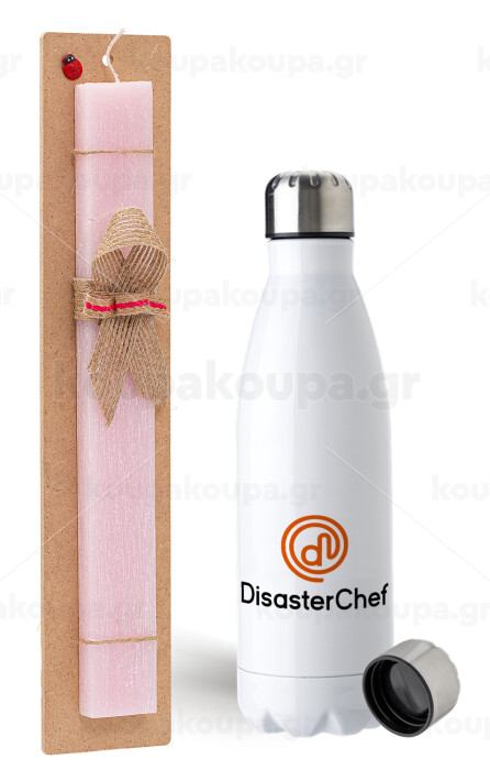 Disaster Chef, Easter Set, metallic stainless steel water bottle (750ml) & scented flat Easter candle (30cm) (PINK)