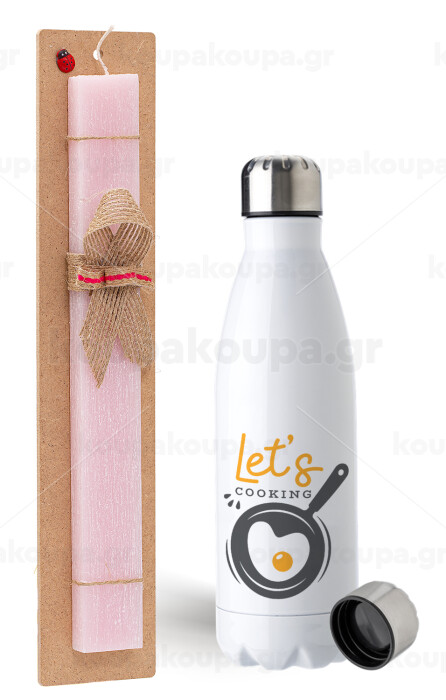 Let's cooking, Easter Set, metallic stainless steel water bottle (750ml) & scented flat Easter candle (30cm) (PINK)