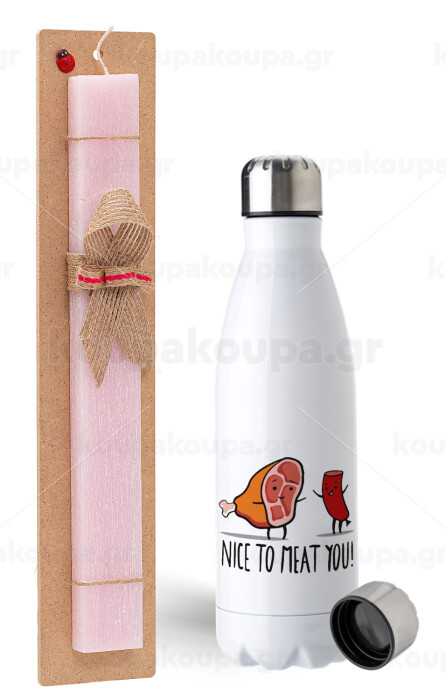 Nice to MEAT you, Easter Set, metallic stainless steel water bottle (750ml) & scented flat Easter candle (30cm) (PINK)