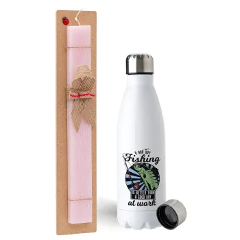 A bad day FISHING is better than a good day at work, Easter Set, metallic stainless steel water bottle (750ml) & scented flat Easter candle (30cm) (PINK)
