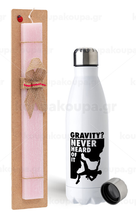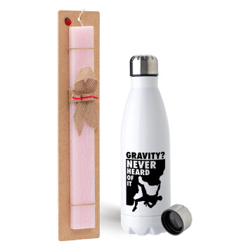 Gravity? Never heard of that!, Easter Set, metallic stainless steel water bottle (750ml) & scented flat Easter candle (30cm) (PINK)