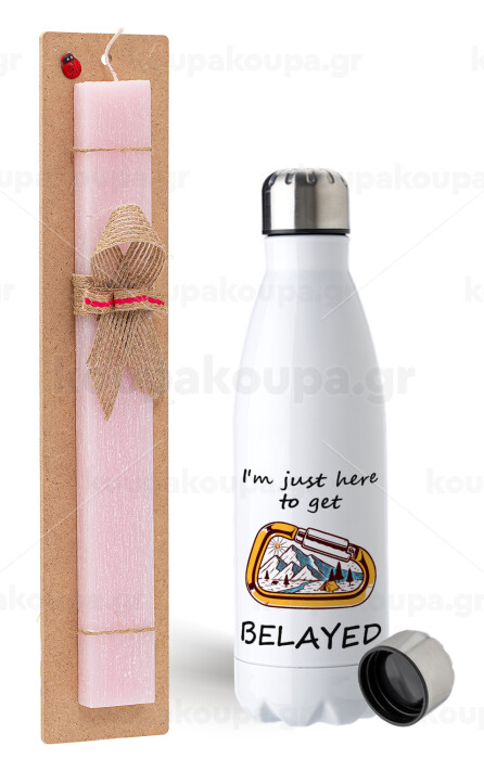 I'm just here to get Belayed, Easter Set, metallic stainless steel water bottle (750ml) & scented flat Easter candle (30cm) (PINK)