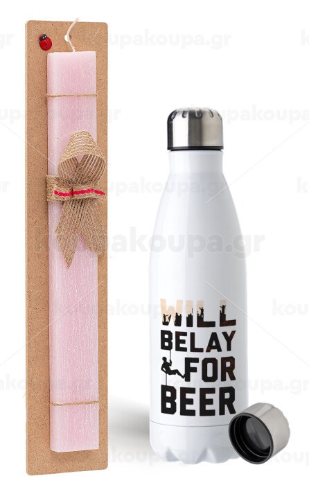Will Belay For Beer, Easter Set, metallic stainless steel water bottle (750ml) & scented flat Easter candle (30cm) (PINK)