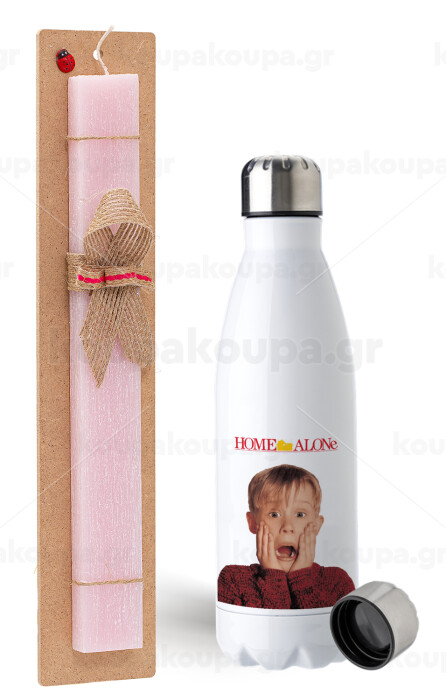 Μόνος στο σπίτι Kevin McCallister Shocked, Easter Set, metallic stainless steel water bottle (750ml) & scented flat Easter candle (30cm) (PINK)
