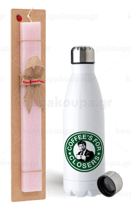 Coffee's for closers, Easter Set, metallic stainless steel water bottle (750ml) & scented flat Easter candle (30cm) (PINK)