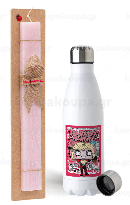 Harley Quinn (Χάρλεϊ Κουίν), Easter Set, metallic stainless steel water bottle (750ml) & scented flat Easter candle (30cm) (PINK)