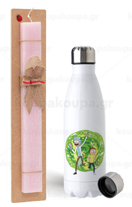 Rick and Morty, Easter Set, metallic stainless steel water bottle (750ml) & scented flat Easter candle (30cm) (PINK)
