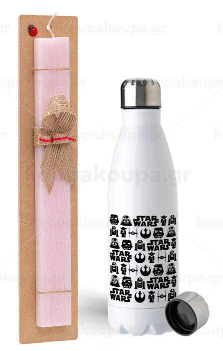 Star Wars Pattern, Easter Set, metallic stainless steel water bottle (750ml) & scented flat Easter candle (30cm) (PINK)