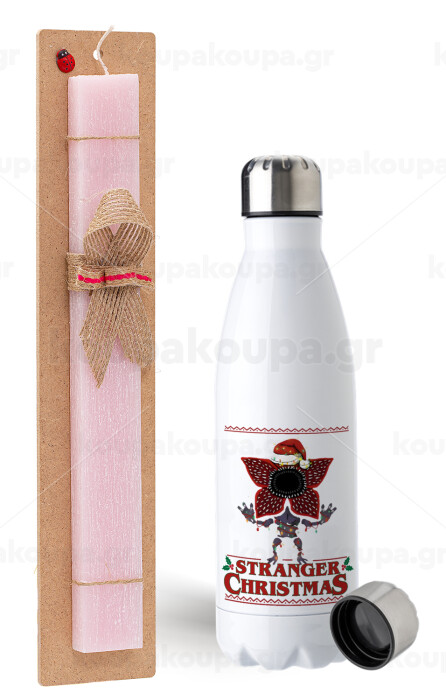 Stranger Things Christmas, Easter Set, metallic stainless steel water bottle (750ml) & scented flat Easter candle (30cm) (PINK)