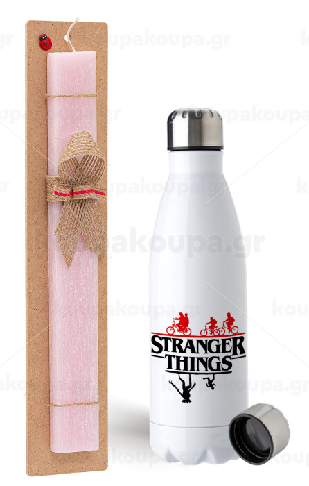 Stranger Things upside down, Easter Set, metallic stainless steel water bottle (750ml) & scented flat Easter candle (30cm) (PINK)