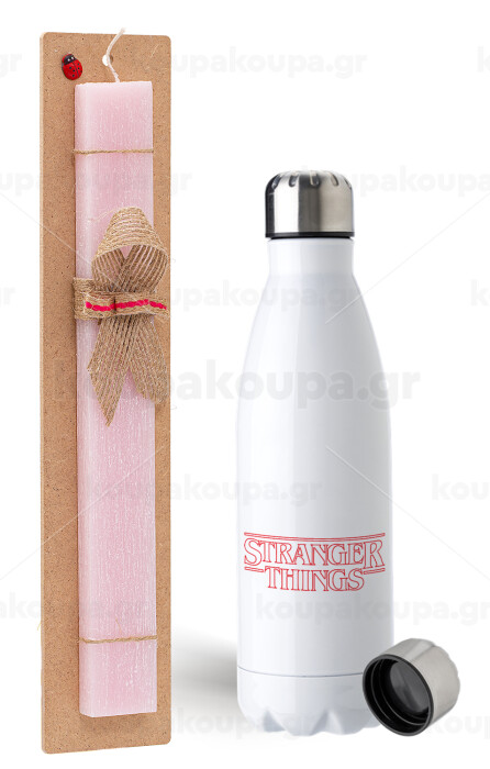 Stranger Things Logo, Easter Set, metallic stainless steel water bottle (750ml) & scented flat Easter candle (30cm) (PINK)