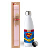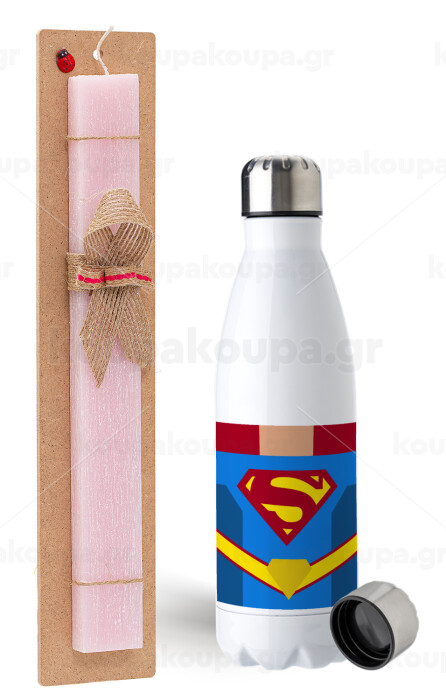 Superman flat, Easter Set, metallic stainless steel water bottle (750ml) & scented flat Easter candle (30cm) (PINK)