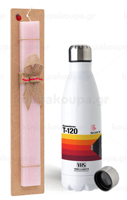 VHS sony dynamicron T-120, Easter Set, metallic stainless steel water bottle (750ml) & scented flat Easter candle (30cm) (PINK)