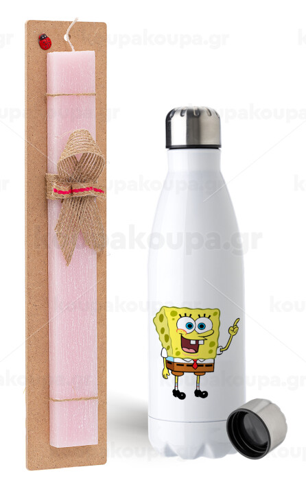 SpongeBob SquarePants character, Easter Set, metallic stainless steel water bottle (750ml) & scented flat Easter candle (30cm) (PINK)