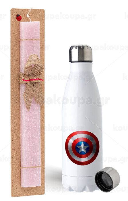 Captain America, Easter Set, metallic stainless steel water bottle (750ml) & scented flat Easter candle (30cm) (PINK)