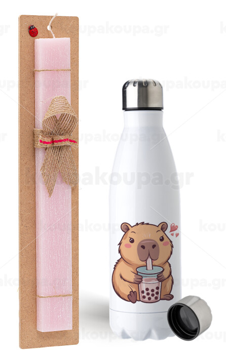 Capybara Bubble Tea, Easter Set, metallic stainless steel water bottle (750ml) & scented flat Easter candle (30cm) (PINK)