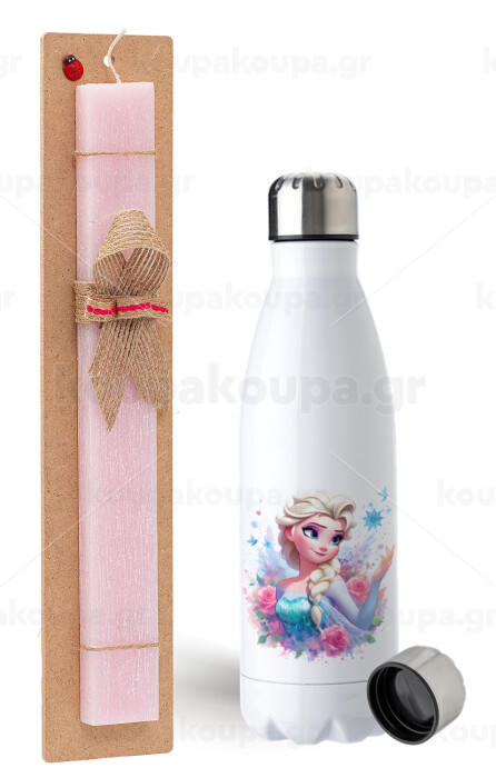 Elsa Princess, Easter Set, metallic stainless steel water bottle (750ml) & scented flat Easter candle (30cm) (PINK)